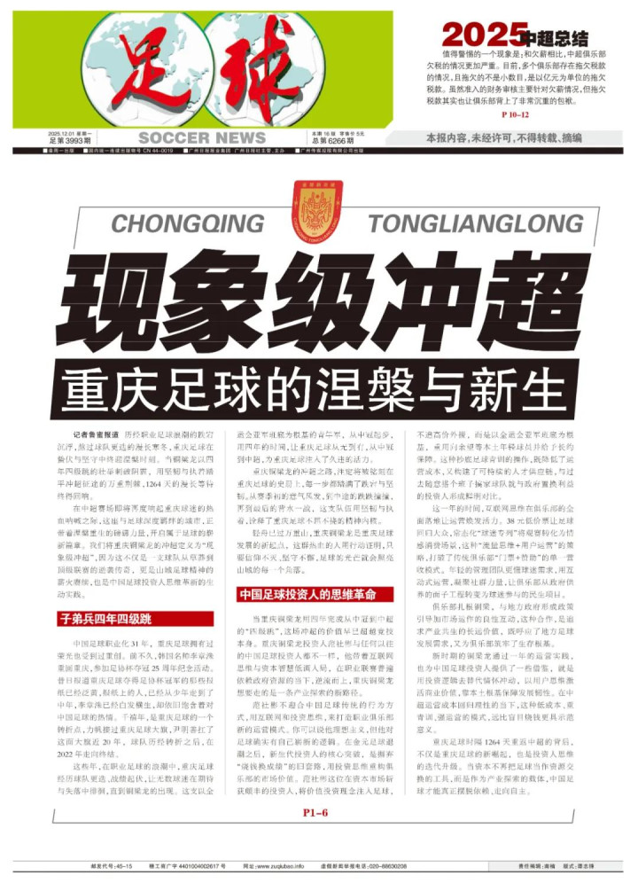 在中超赛场行将再度响起重庆球迷的热血呼吁之际,这座与足球深度羁绊的城市,正带着涅槃更生的磅礴力量,开启属于足球的簇新篇章。咱们将重庆铜梁龙的冲超界说为“气候级冲超”,因为这不仅是一支球队从草野到顶级联赛的逆袭据说,更是山城足球精神的薪火连接,亦然中国足球投资东谈主念念维改良的活泼实施。