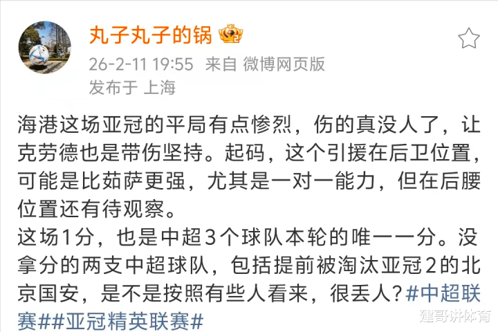 上海官方记者“丸子”称:上海海港这场亚冠平局拼的很惨烈,这场1分,亦然中超3个球队在本轮的独逐个份,没拿分的中超球队,包括被提前淘汰的北京国安。顺带点评了一下疑似拉垮的北京国安队后,上海名记最近归来是:是不是按照有些东谈主看来,很丢东谈主?