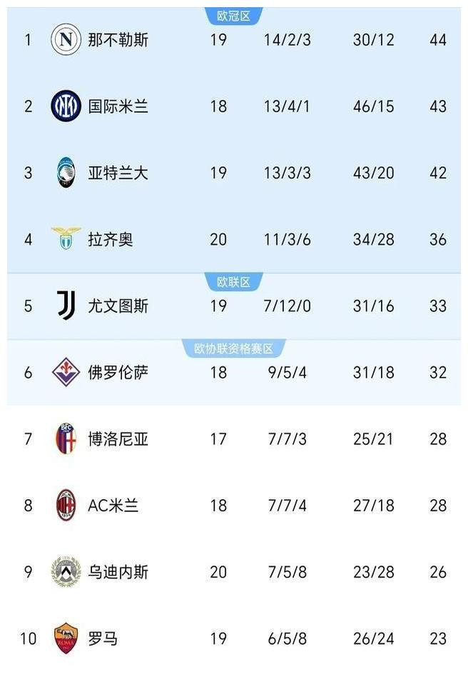 意甲的战局的确越来越扑朔迷离。刚刚放胆的第20轮比赛中,国米以1-0小胜升班马威尼斯,豪取联赛六连胜,积分追至44分,离榜首仅有1分之差。而热那亚也出头出头,凭借弗伦德鲁普的制胜球,1-0力克帕尔马,强势追平了罗马的积分,展现出他们的复苏之势。要知说念,罗马现在在积分榜上的位置可不太适当,随时可能被反超。这场比赛后,前3名的球队之间仅出入2分,的确让东说念主握了一把汗!